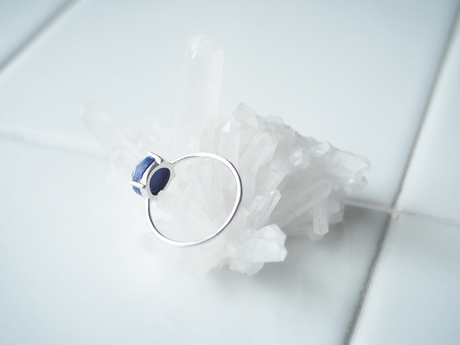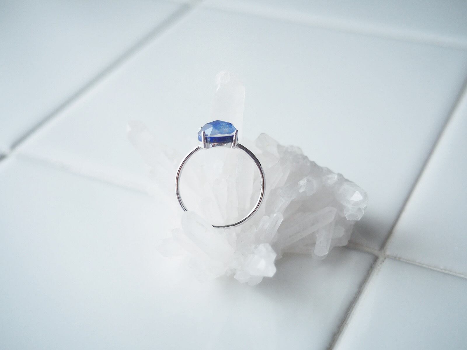 しばしば黄鉄鉱の粒を含んで夜空のような輝きを持つラピスラズリの上に、ローズカットされた水晶が重なった透明感あふれるリングです。