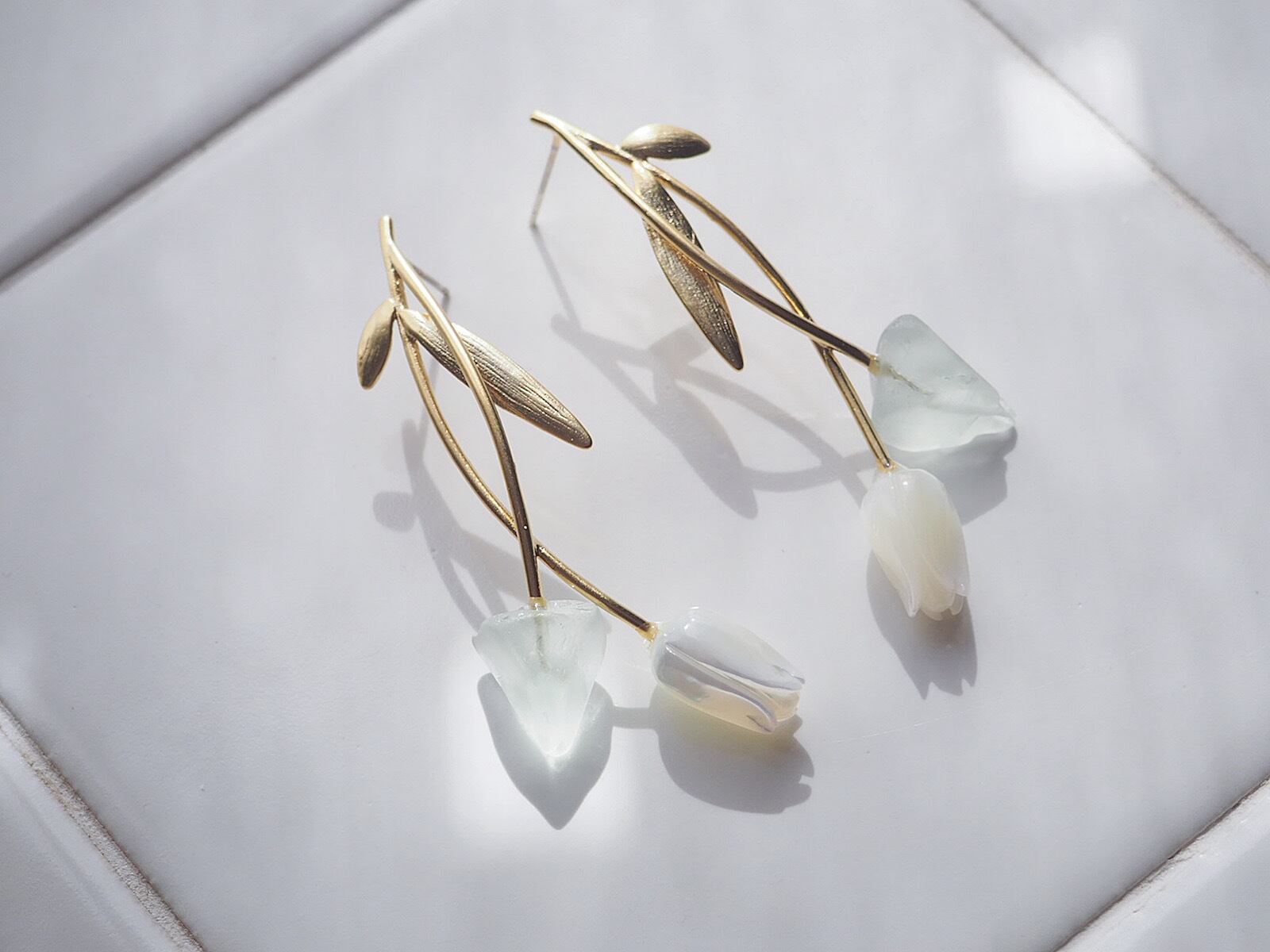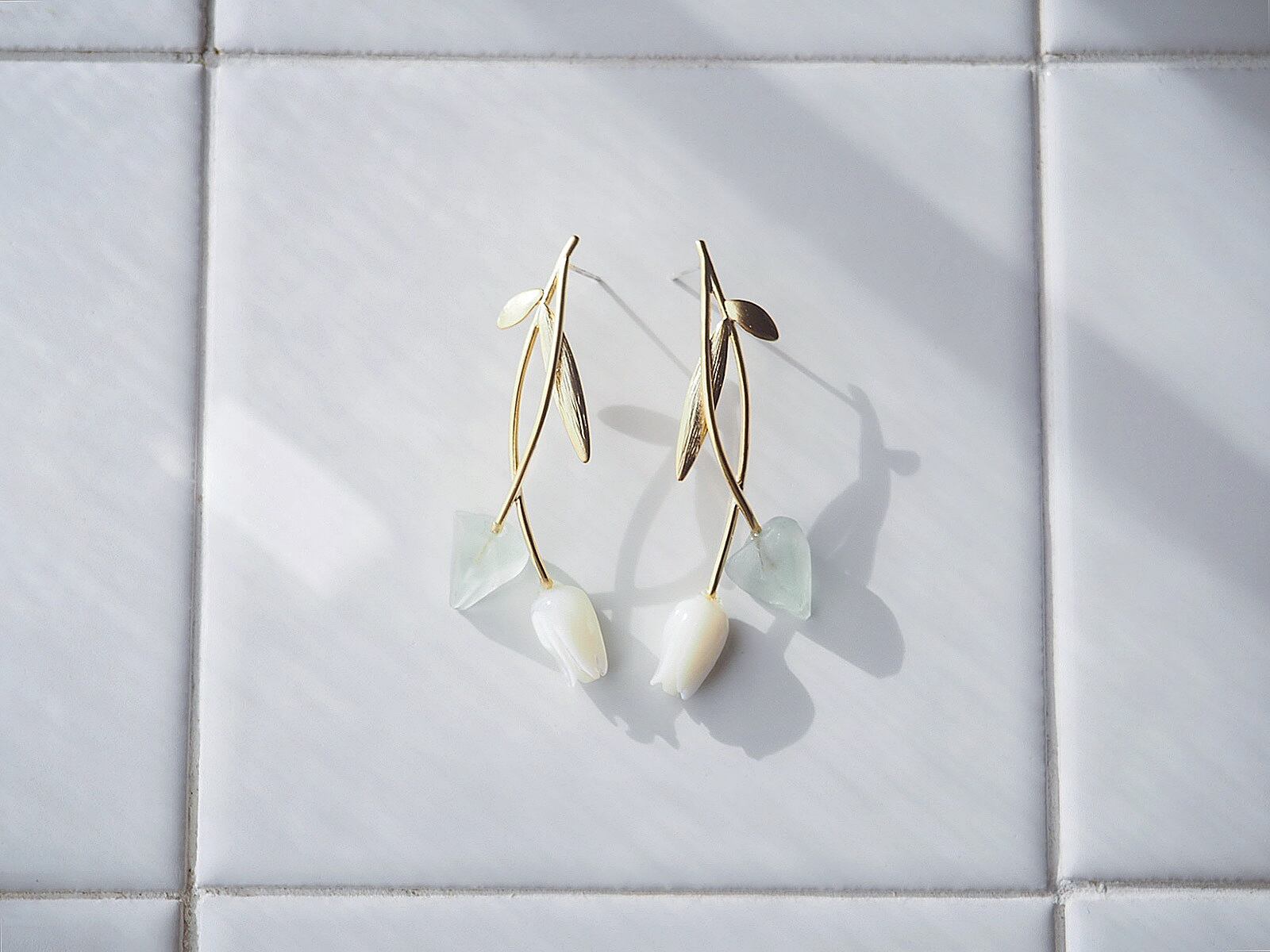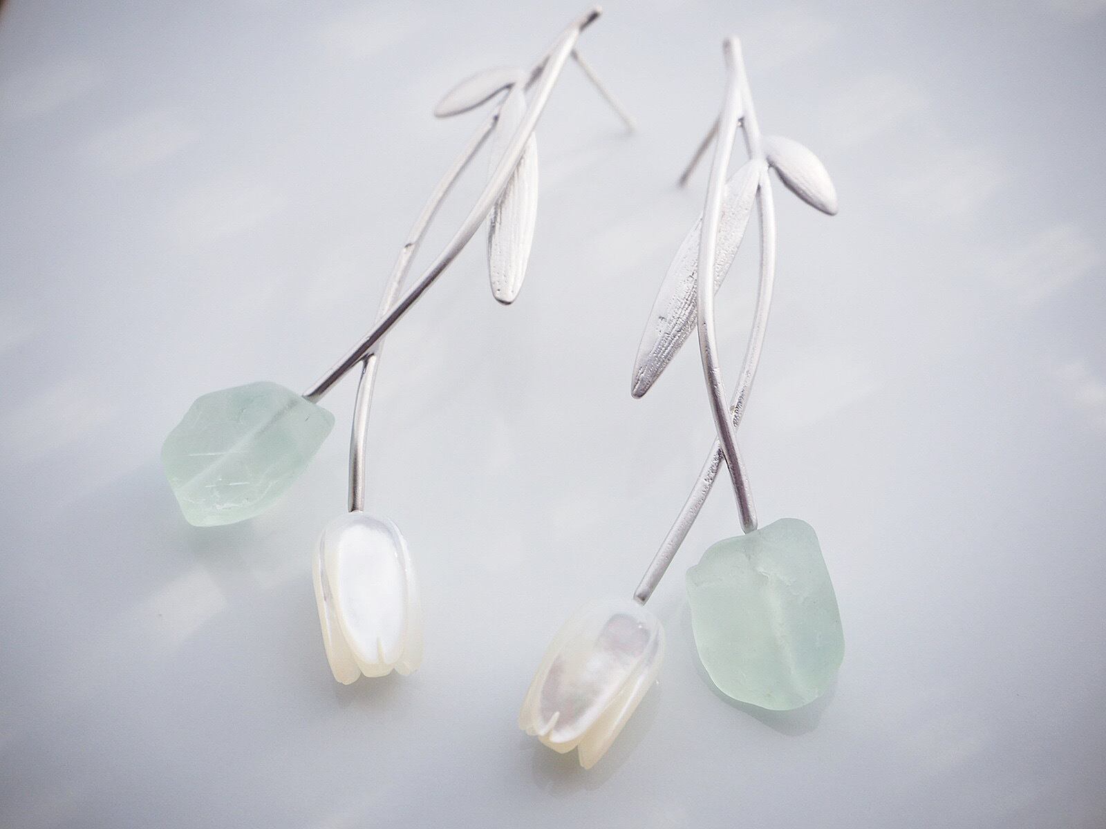 柔らかな光沢のホワイトシェルとフロストがかったグリーンフローライトのつぼみが優しくきらめくピアスです。