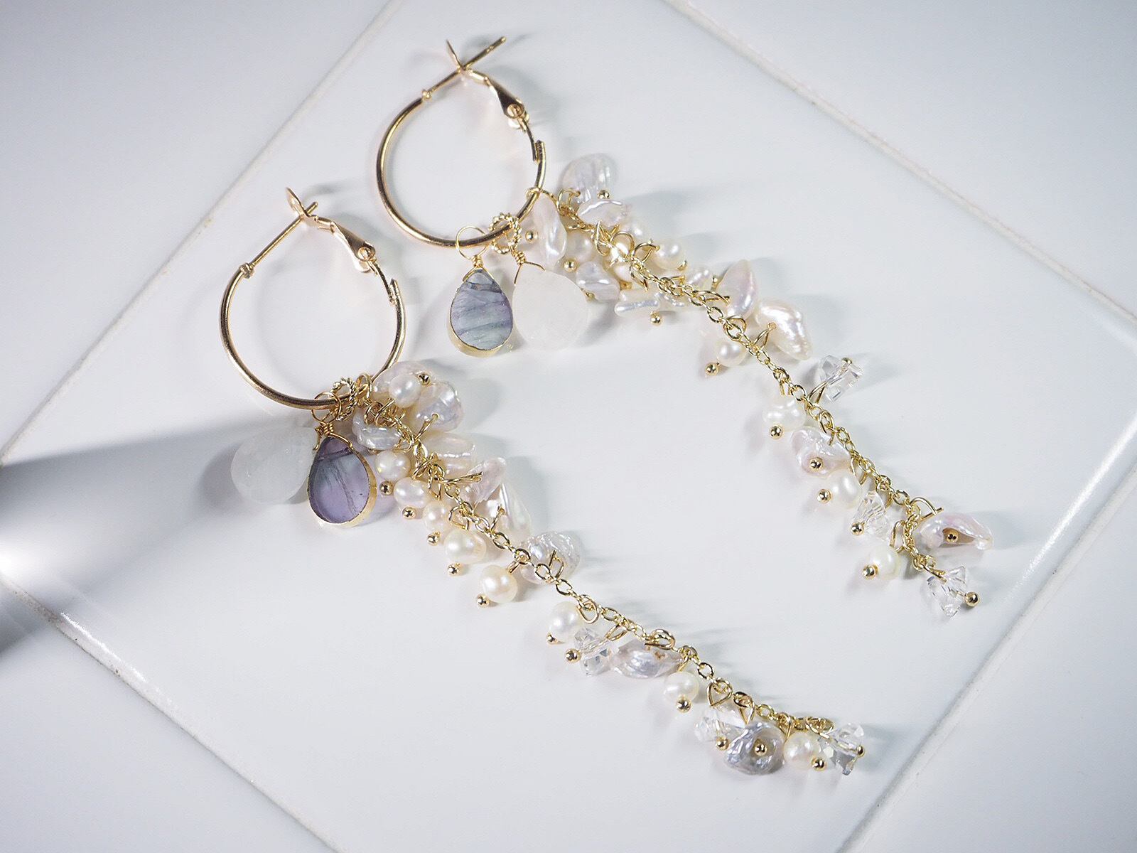フローライト・ムーンストーン・淡水パールのアレンジピアス/イヤリング