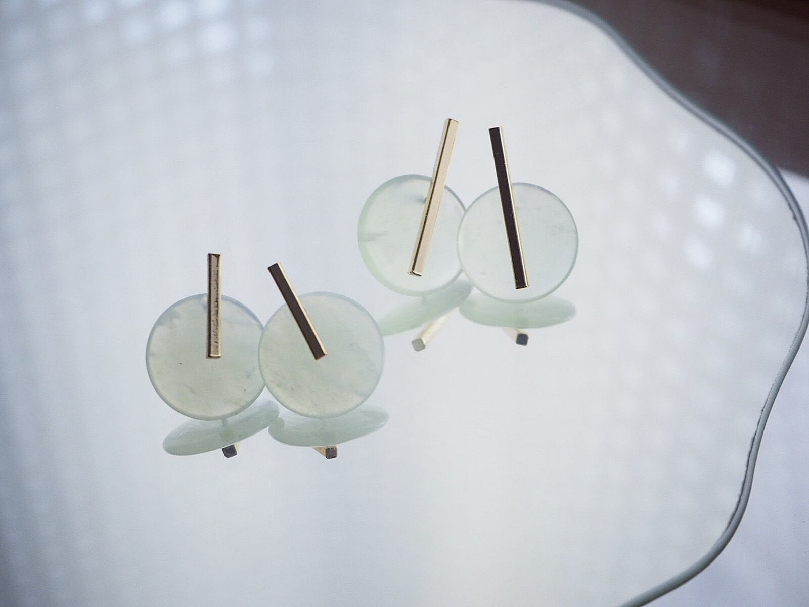 ミルキーカラーのニュージェイドと細身の金具を合わせ、洗練された印象のピアス/イヤリングにお仕立ていたしました。