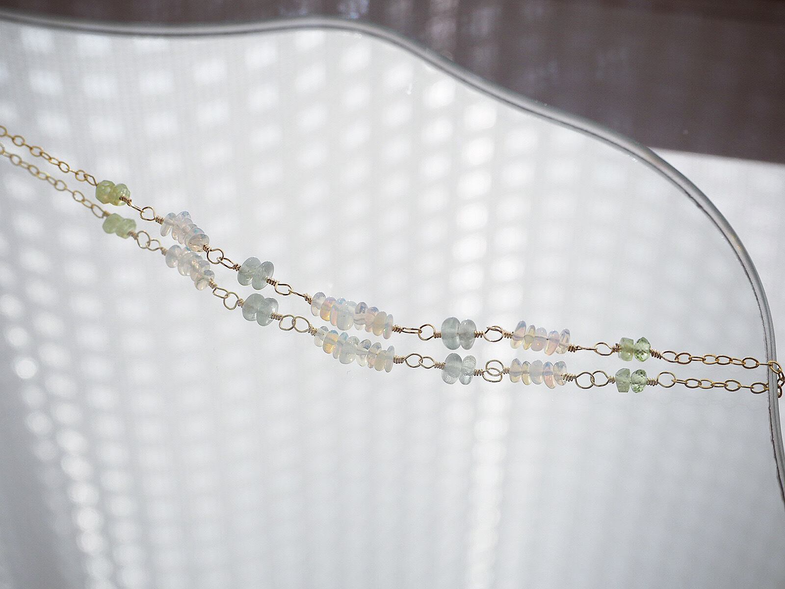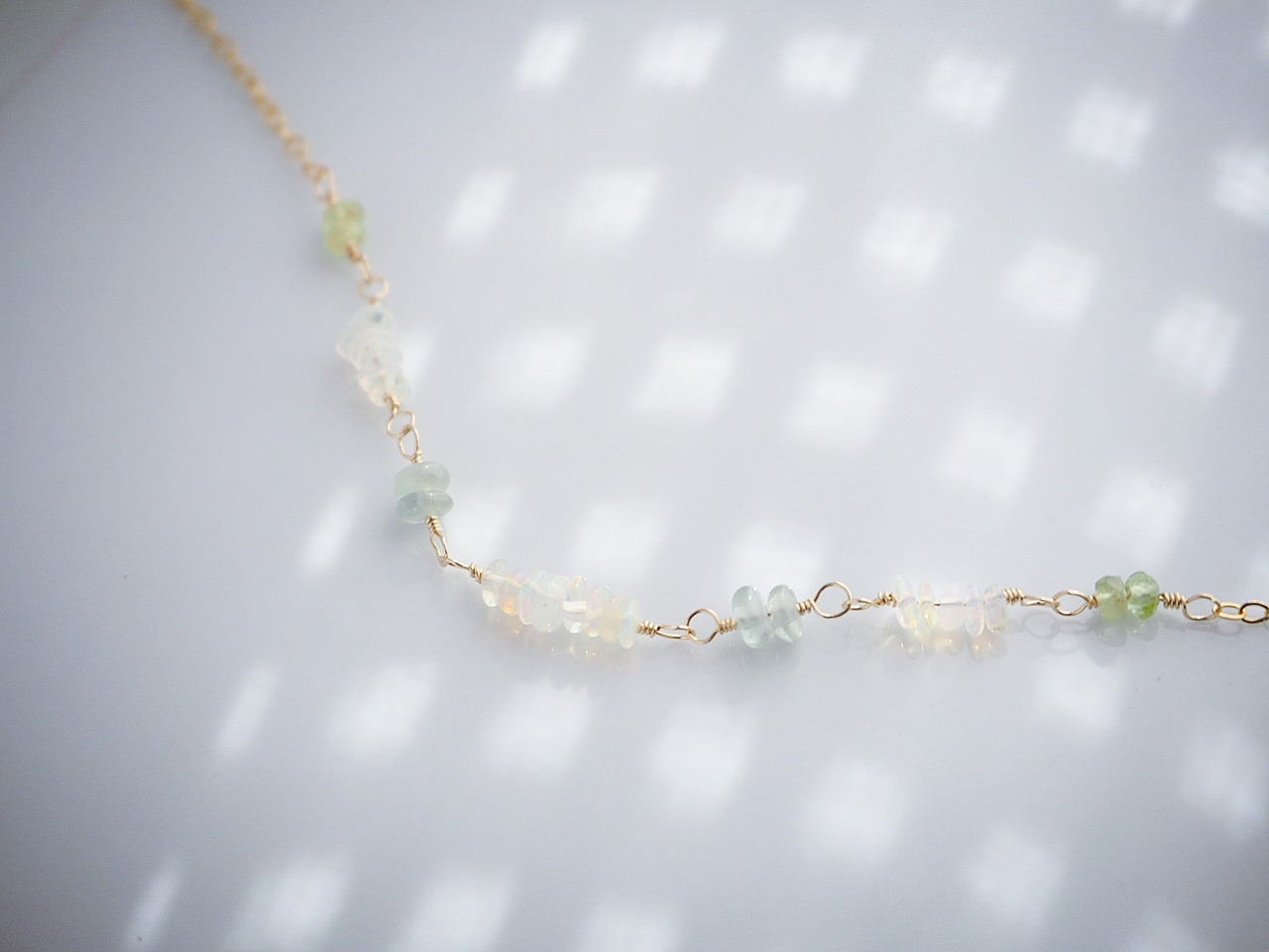 たくさんの恵みが宝石となり、光の波やすきとおった風のほめことばをきらきらと繋いだような繊細なネックレスです。