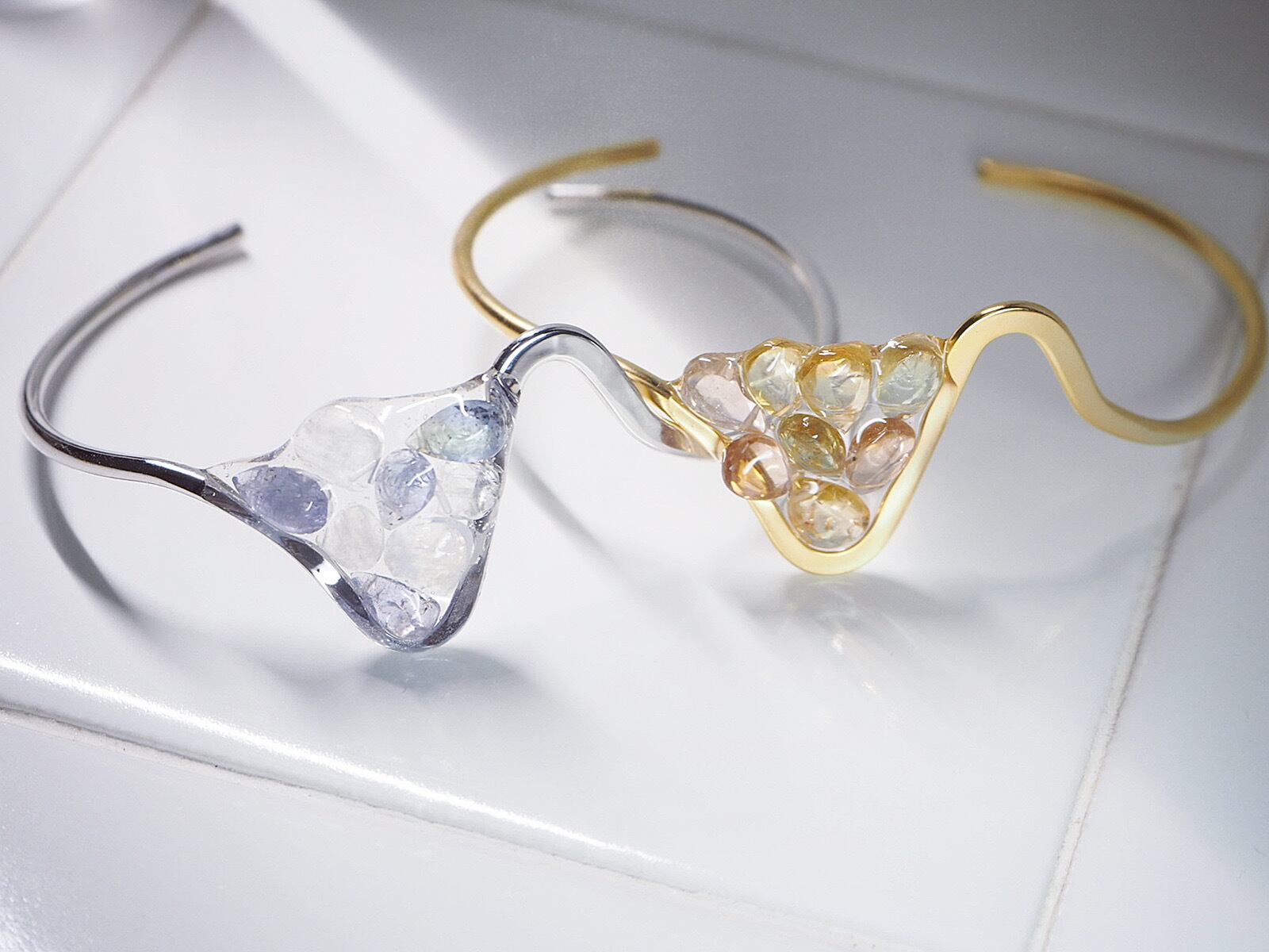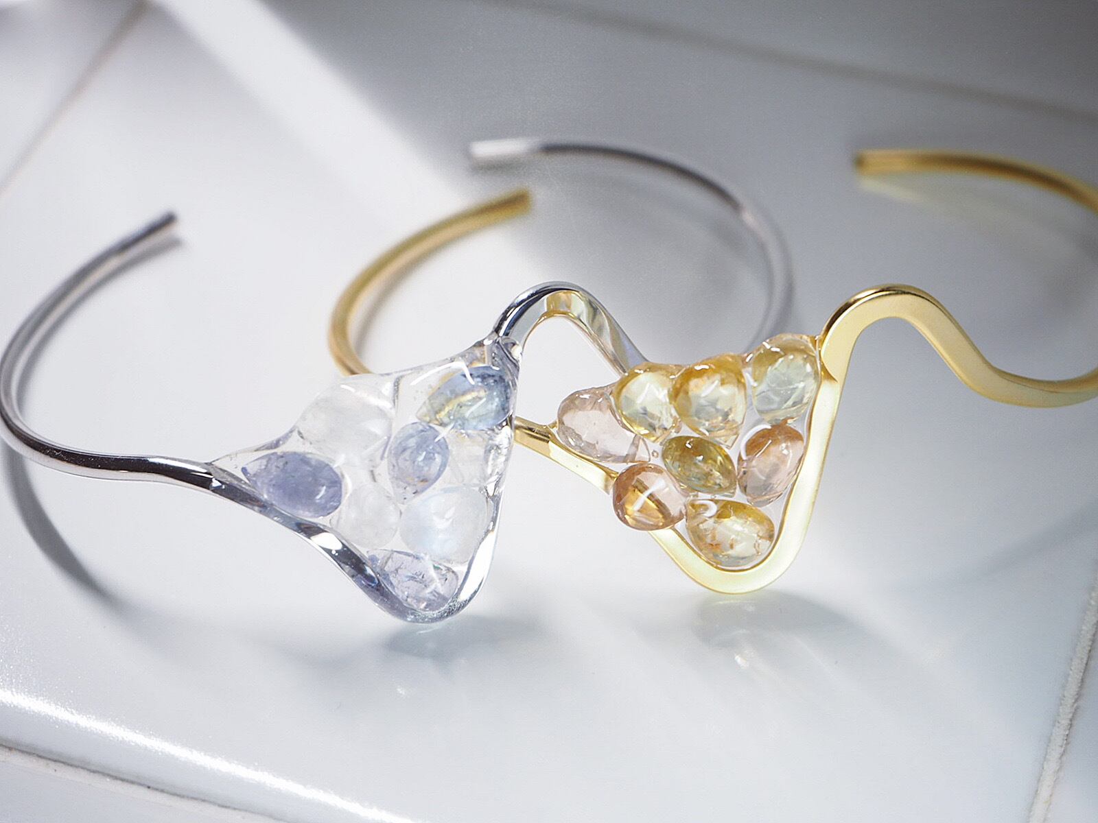 ※バングルを広げたり詰めたりというような調整はできません。無理に力を加えた場合、接着面が破損してしまう恐れがあります。取り扱いには十分にお気をつけください。